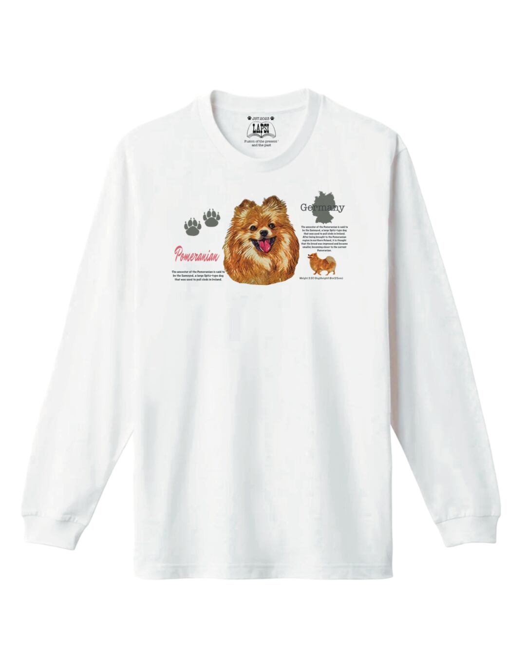 ポメラニアンは、ふわふわとした二重被毛と豊かな尾を持っており、小さな体に比べて存在感があります。彼らは元々トナカイのような外見を持つ犬種で、厳しい気候にも耐えることができます。このような、歴史や用途に関する簡潔な解説も、ロンTのデザインに組み込まれています。
